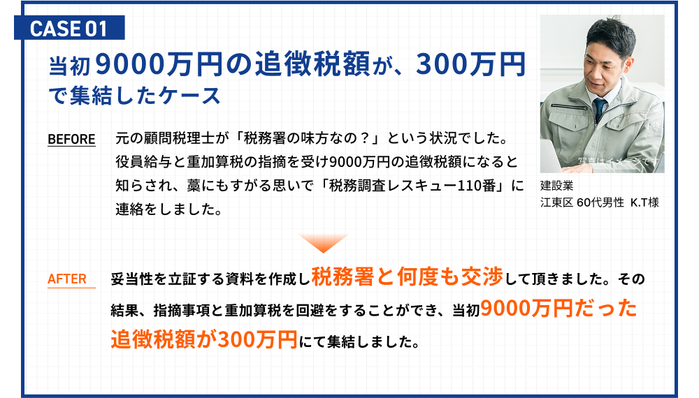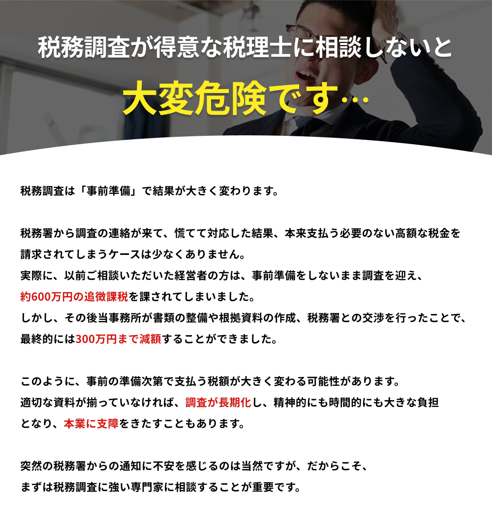 すぐに「税務調査レスキュー110番」にお電話ください! 税務調査官という国家機関に対して1人で戦うことは圧倒的不利を意味します。税額が確定されてからでは遅いです! 悩む前に、今すぐご相談ください。