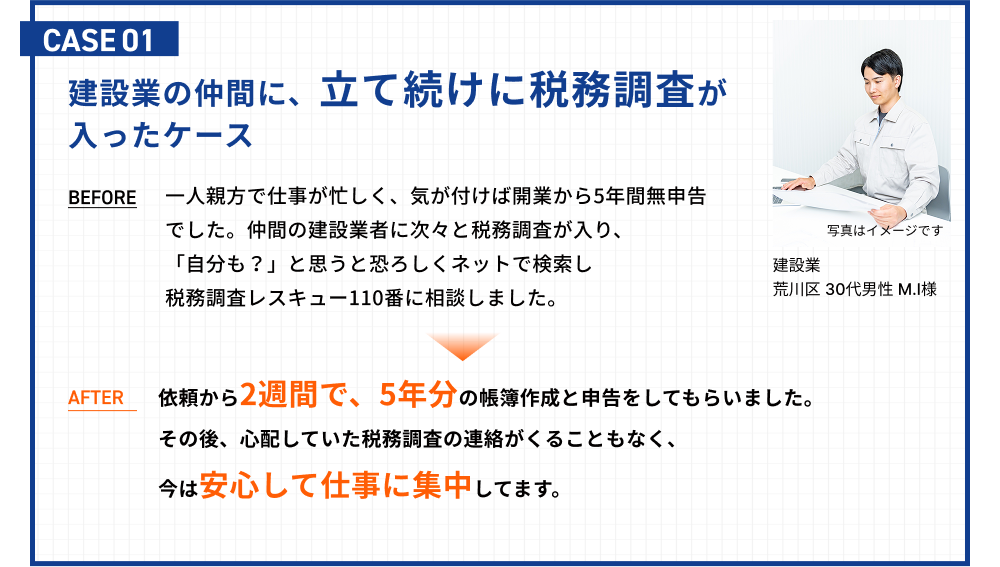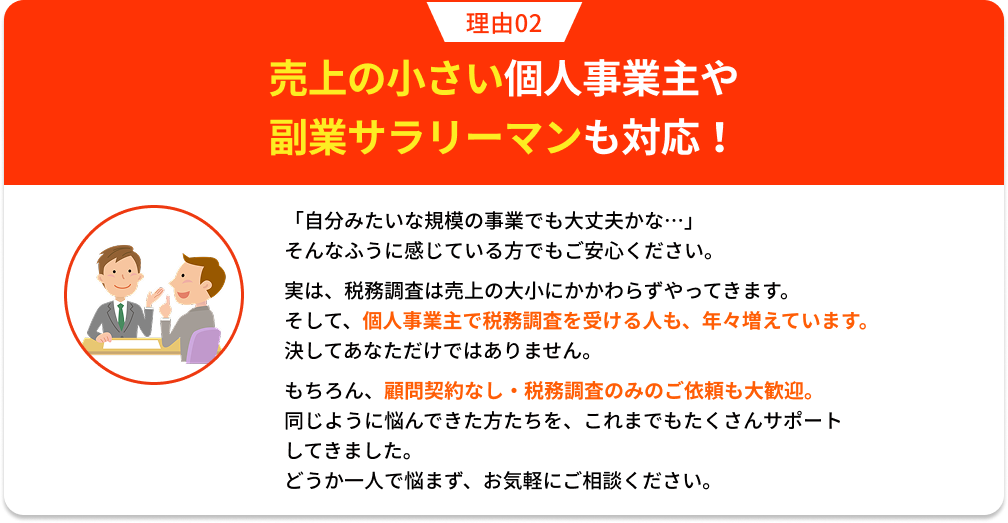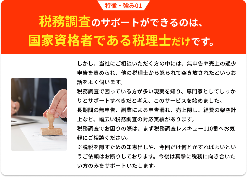 私たちは、税務調査でお困りの個人事業主や法人を、税務署とのやり取りから守る税務調査専門の税理士事務所です。