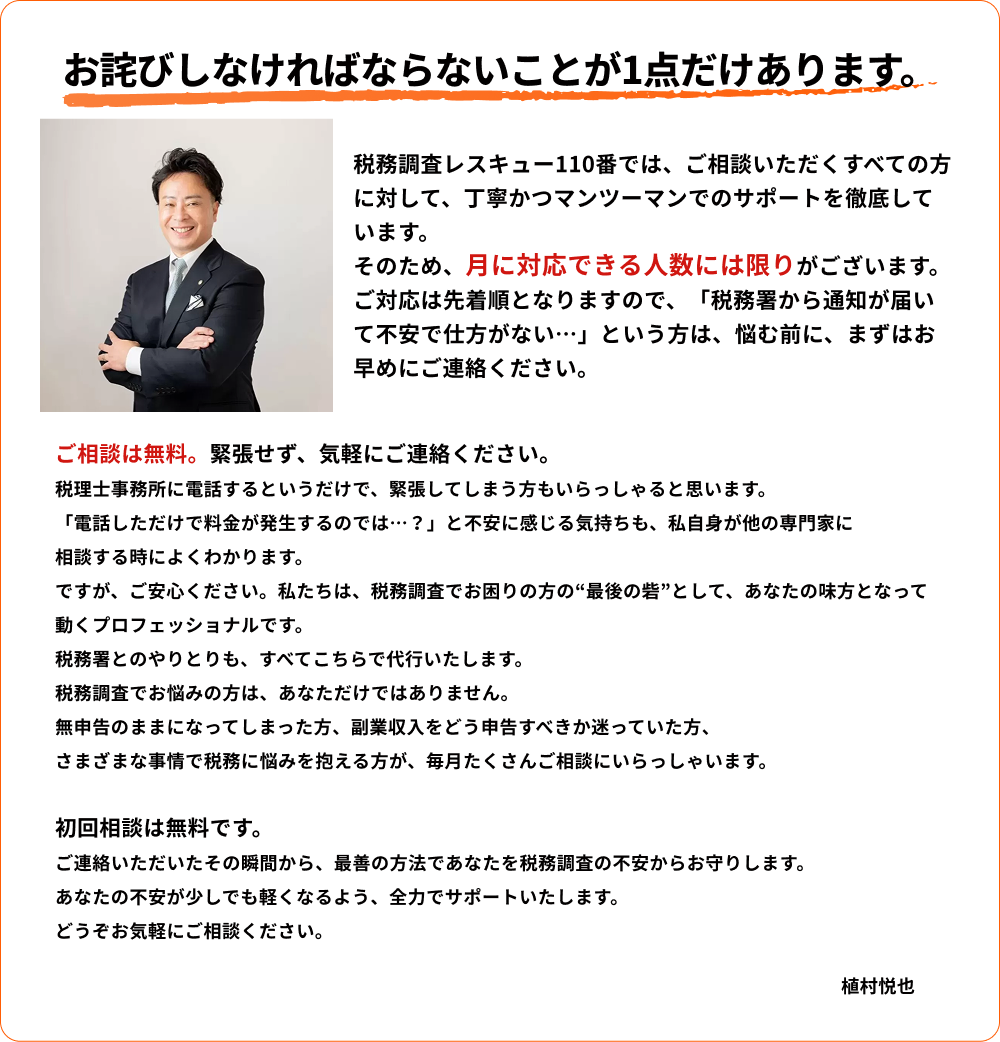 税務調査レスキュー110番 代表税理士の植村悦也です。